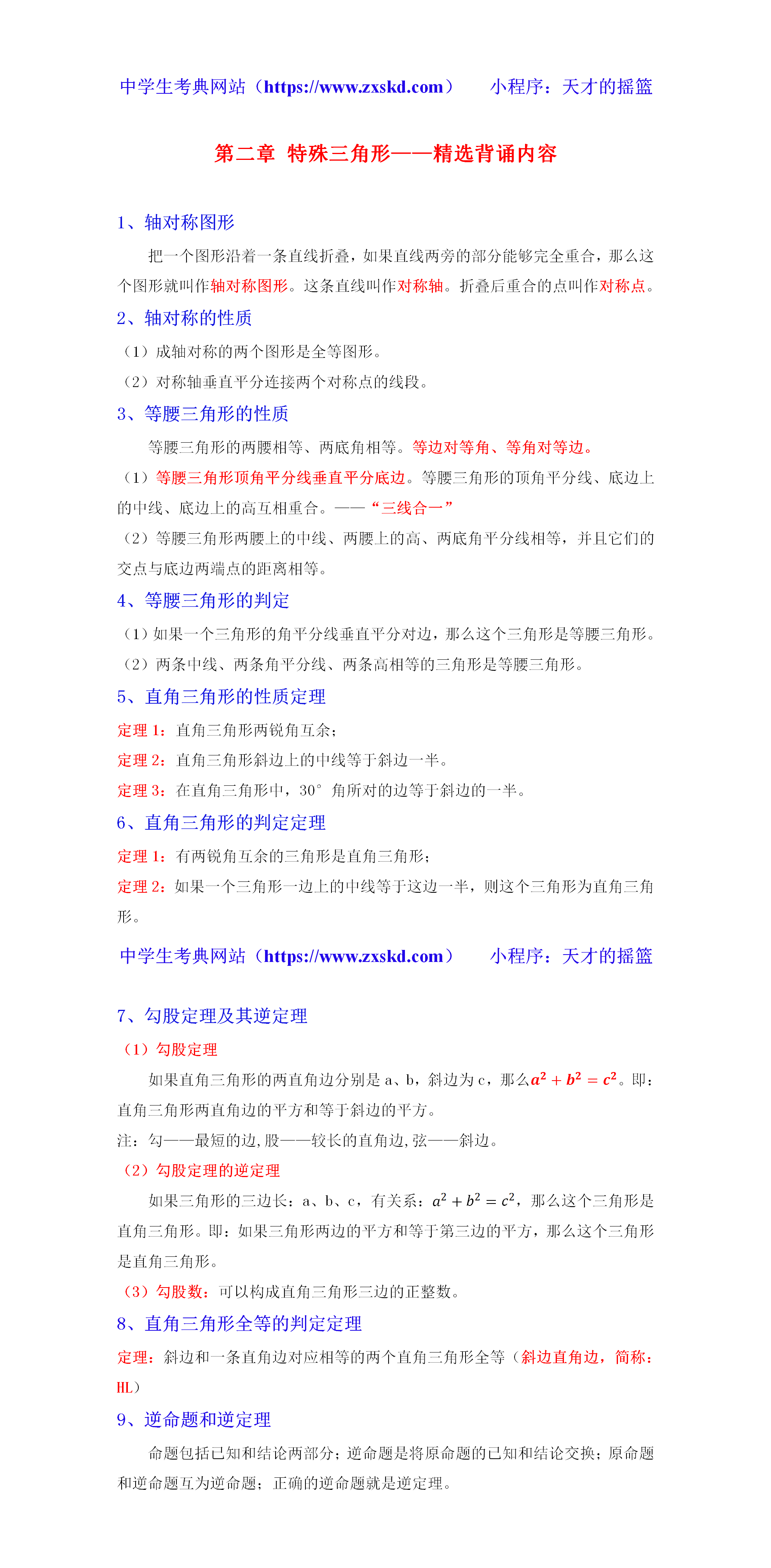 浙教版数学八上第二章 特殊三角形——精选背诵内容