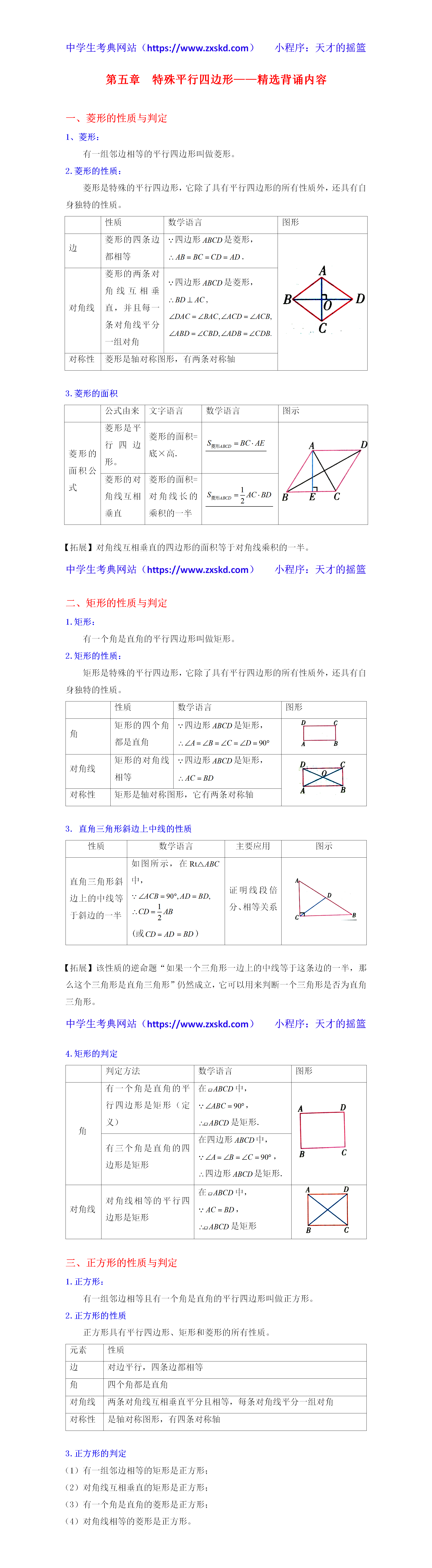 浙教版数学八下第五章 特殊平行四边形——精选背诵内容