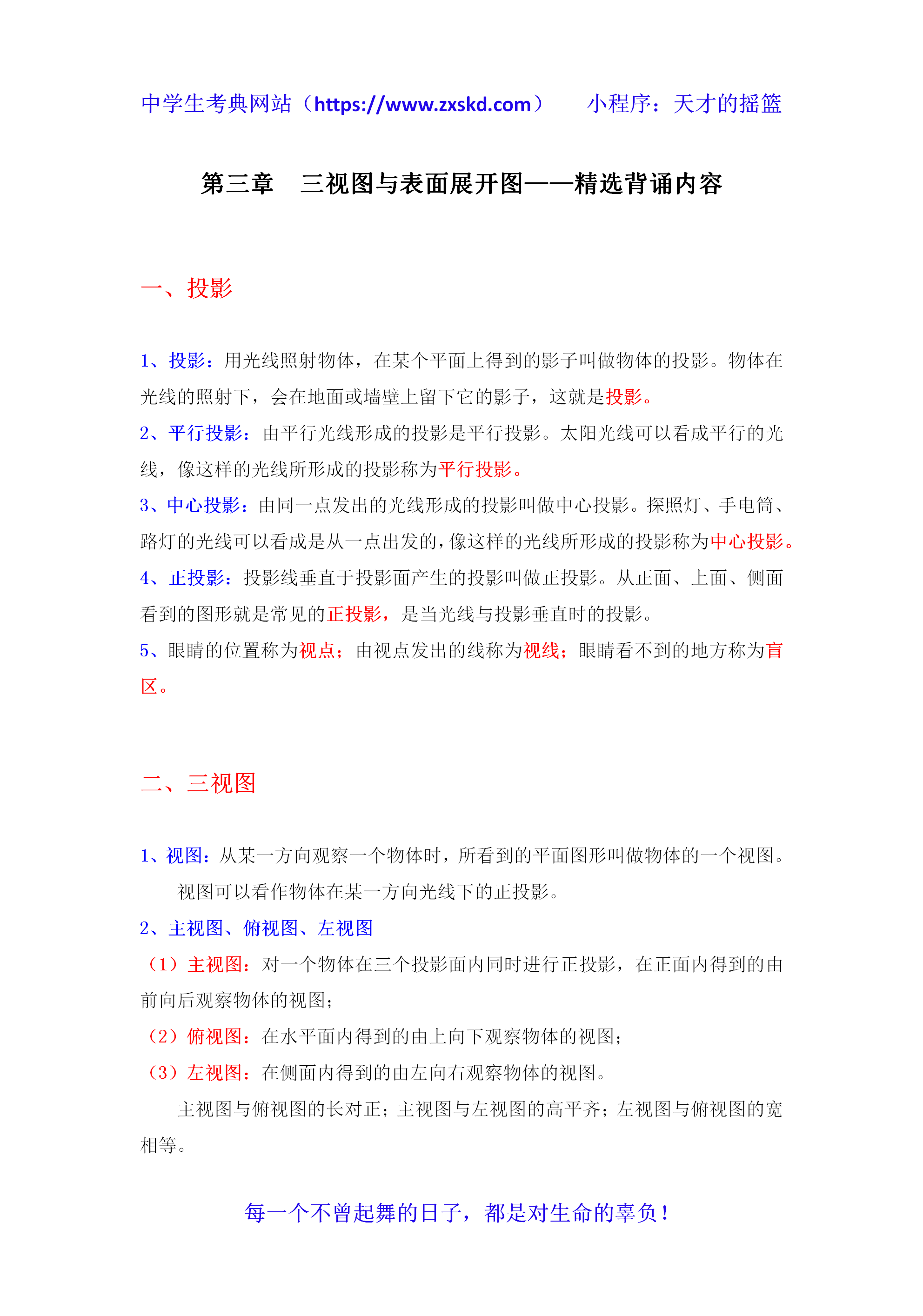 浙教版数学九下第三章 三视图与表面展开图——精选背诵内容